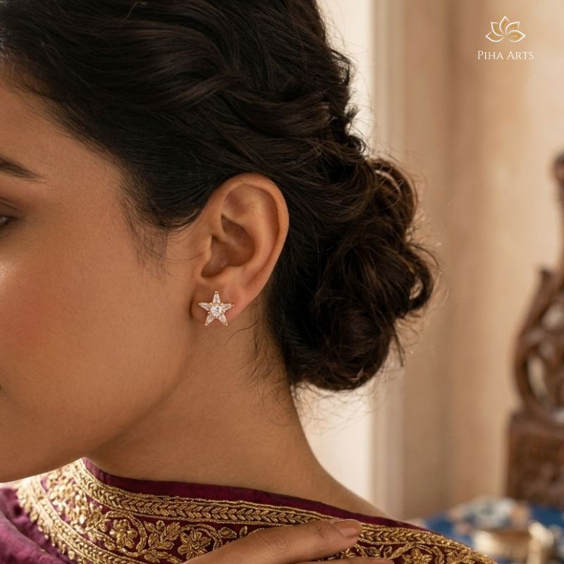Add a stylish sparkle to your look with these AD diamond star stud earrings from Piha Arts. Designed in a sleek star shape with a shining center stone, these earrings offer a modern and elegant feel. Perfect for daily wear, casual outings, and small occasions, these small earrings for women are lightweight and comfortable. Pair them easily with both western and ethnic outfits for a simple yet eye catching look.