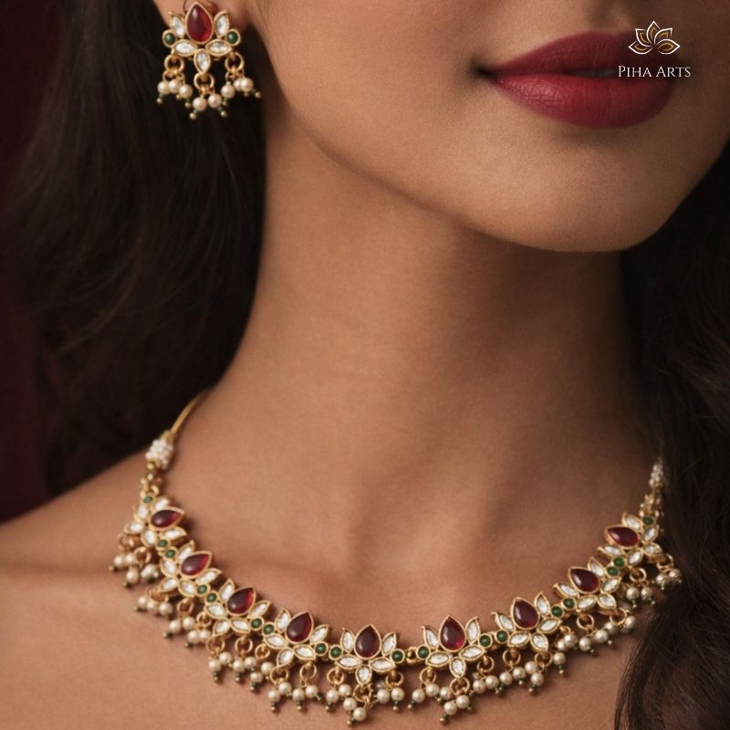 Shop an elegant gold finish kundan necklace set featuring red and green stones with delicate pearl drops and matching earrings. Perfect for weddings, festive occasions, and traditional Indian wear.